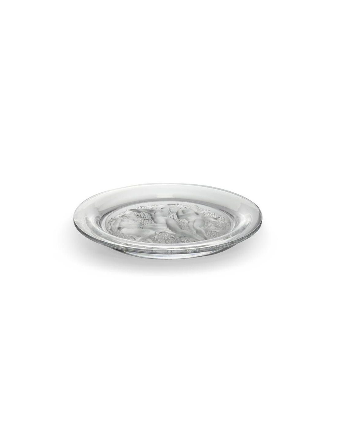 Crystal plate with frosted insert in the center depicting three stylized dancing naked women with a grape motif background