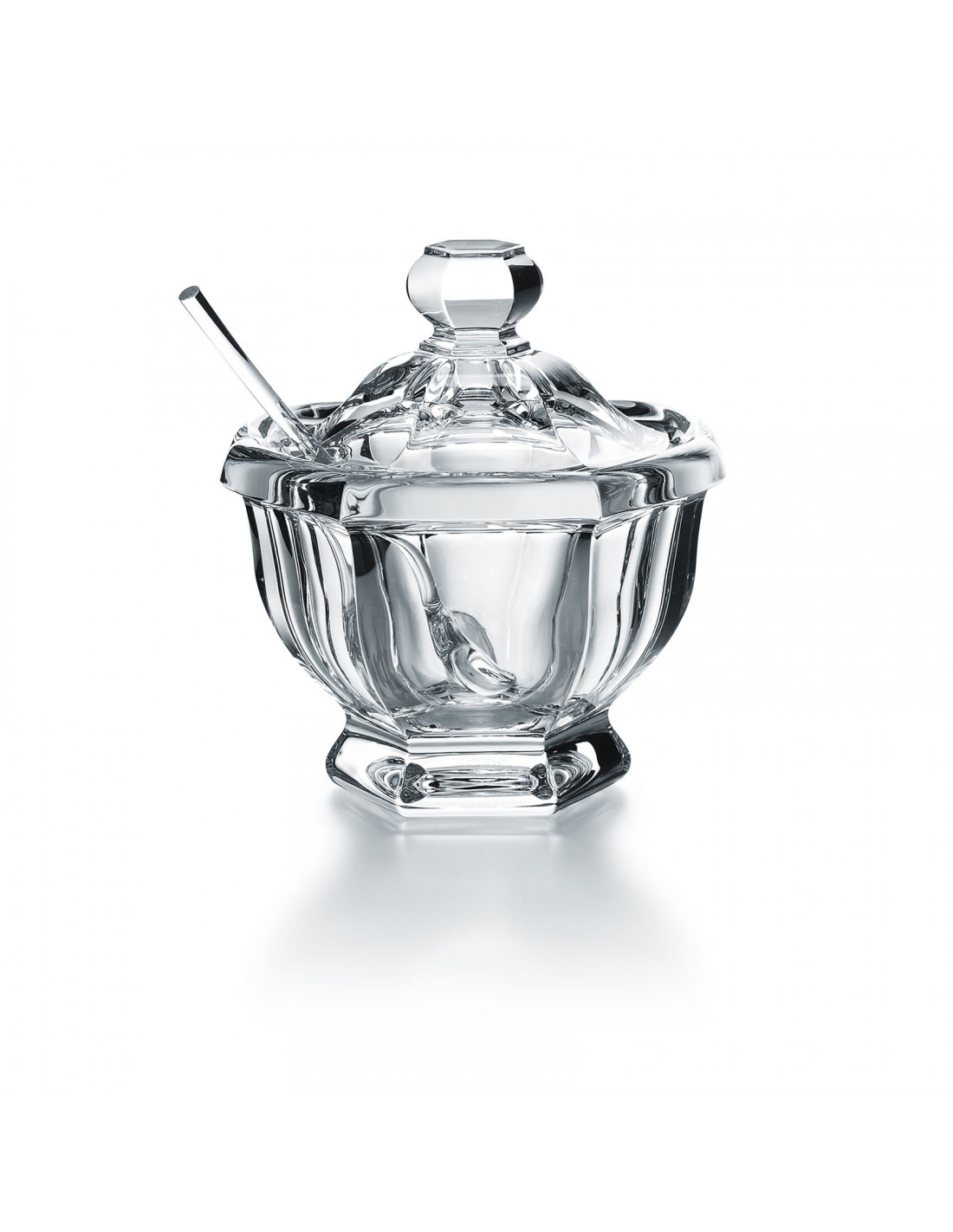The stunning Harcourt Missouri jam jar showcases Baccarat’s rigor of form and beautiful craftsmanship. This jar is a beautiful item perfect for use during a leisurely breakfast, a weekend brunch or a tea-time snack. The lucidity of the Clear crystal provides a magnificent contrast with the vividness of the fruity preserves contained therein. The piece comes with a Baccarat Clear crystal serving spoon. The Harcourt Missouri jam jar is just as readily a standalone decorative piece. The bell-shaped lid is topped with a round knob, and the curved contours of the bowl stand out against the angularity of the crystal spoon, which extends outward at a 45-degree angle from the symmetrical form. A Baccarat Clear crystal Harcourt Missouri mustard jar is also available.