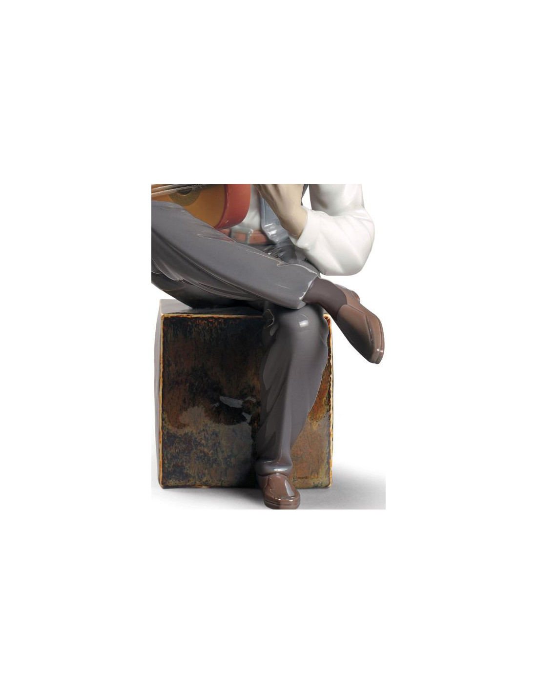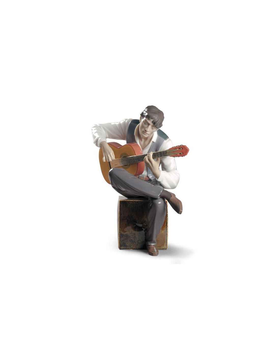 Figura di porcellana brillante di un chitarrista di flamenco seduto su un cubo.