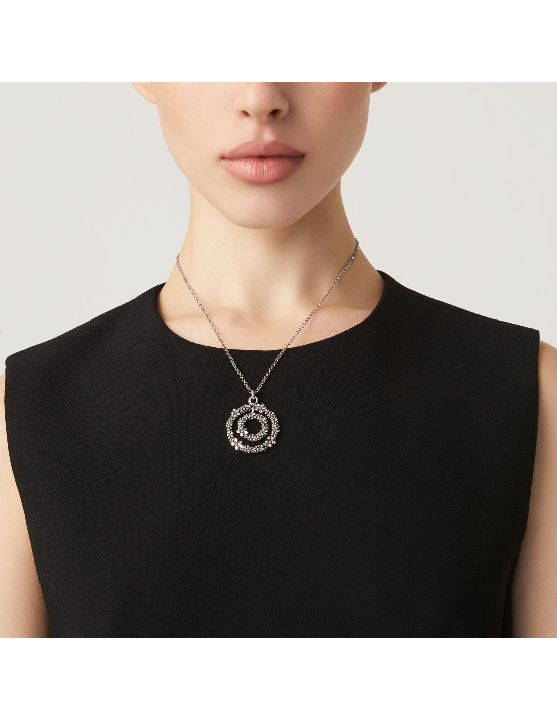 Nel Pendente Millefiori la luce si manifesta mediante la tecnica della "diamantatura", che conferisce ai minuscoli e graziosi petali in argento un effetto scintillante, in contrasto con la base brunita e la lunga catena. Fatto a mano in azienda.