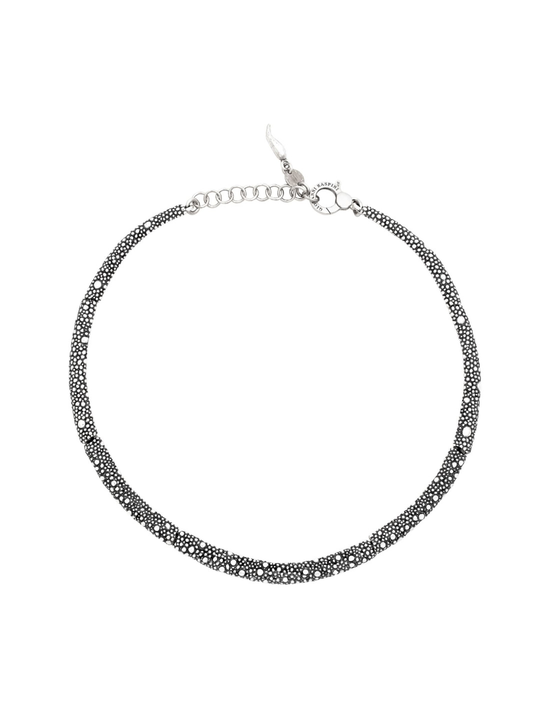 Un capolavoro di maestria orafa, la collana Petit Perlage è una raffinata creazione semirigida che celebra l’arte della fusione a cera persa. Il pavé di sferette in argento brunito, impreziosito da una delicata diamantatura, crea un suggestivo gioco di luci ed ombre che conferisce all’intero gioiello una texture contemporanea e sofisticata. Realizzata a mano in azienda.