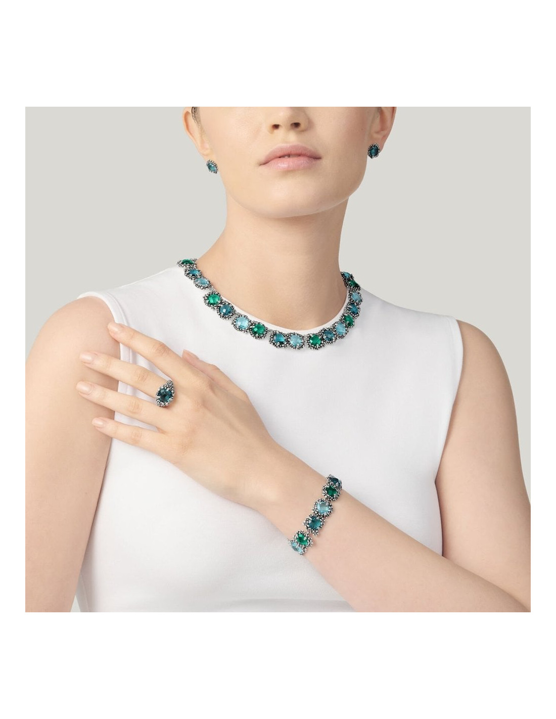 Il bracciale Blue Ivy unisce l’eleganza della lavorazione artigianale all’armonia cromatica di dieci grandi cristalli rotondi sfaccettati, nelle delicate tonalità del celeste, dell’azzurro e del verde smeraldo. Un raffinato decoro ispirato al tema floreale, realizzato con l'antica tecnica della fusione a cera persa, avvolge il bracciale in una danza di piccoli dettagli. Interamente fatto a mano in azienda.
