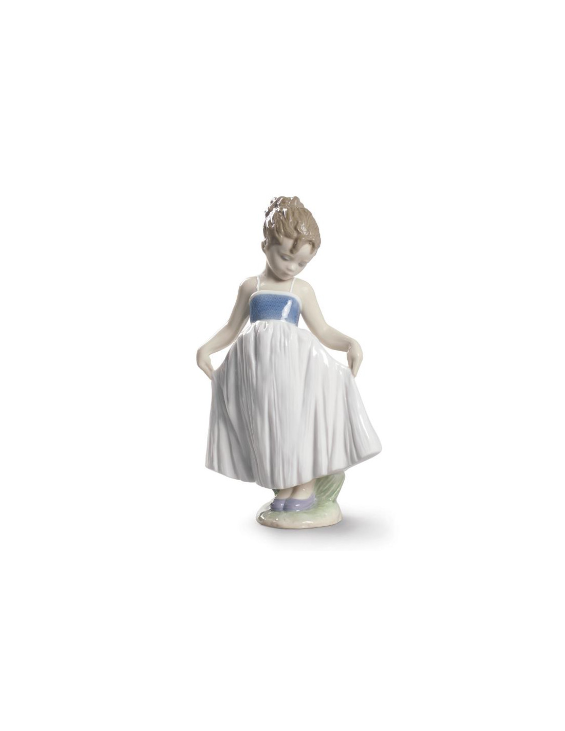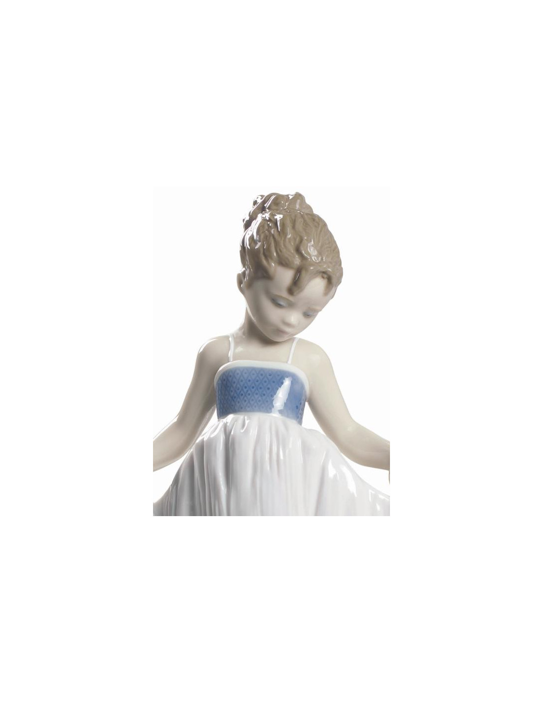 Figurine della porcellana glitter girl tenendo il suo vestito blu e bianco con le scarpe dello stesso colore.