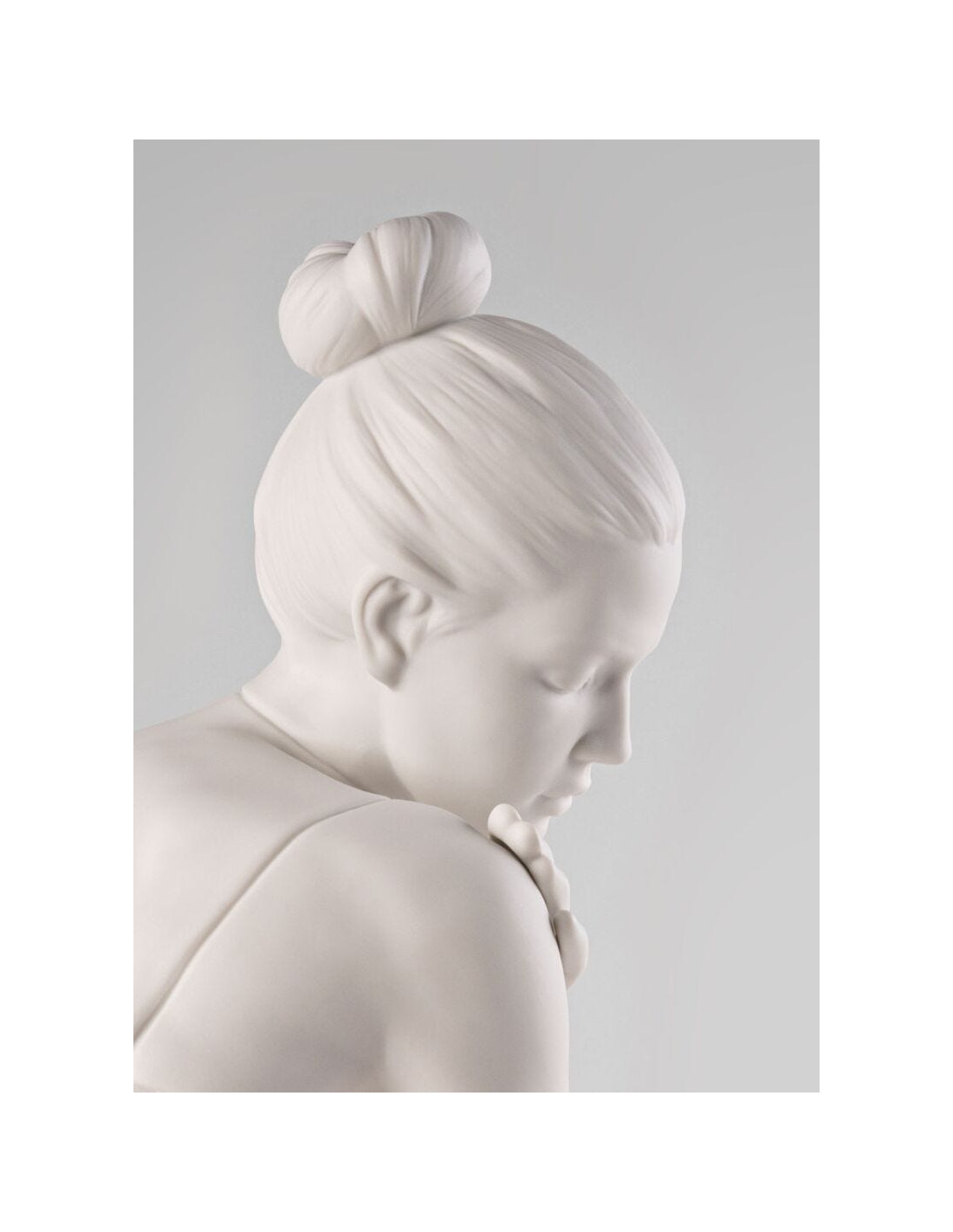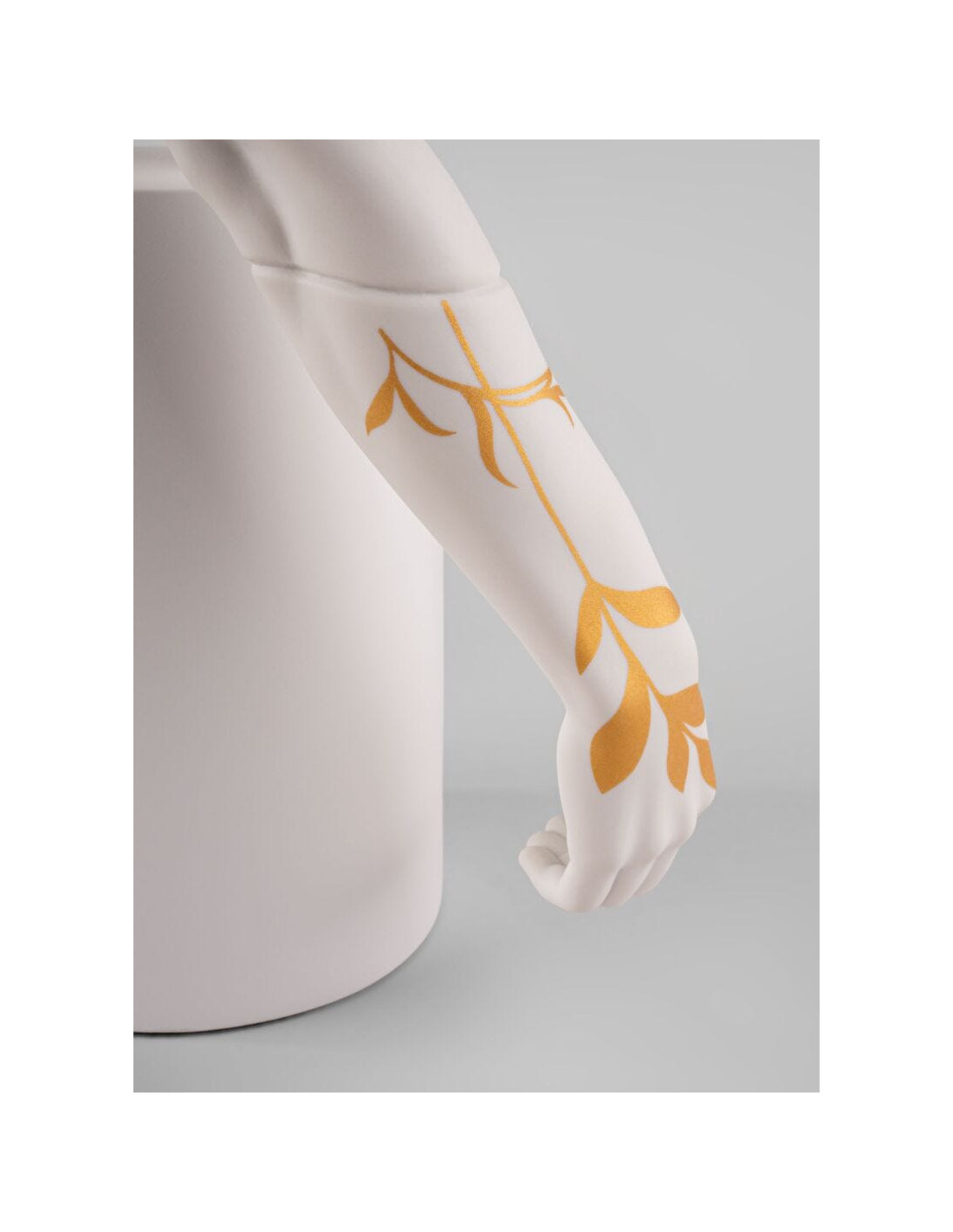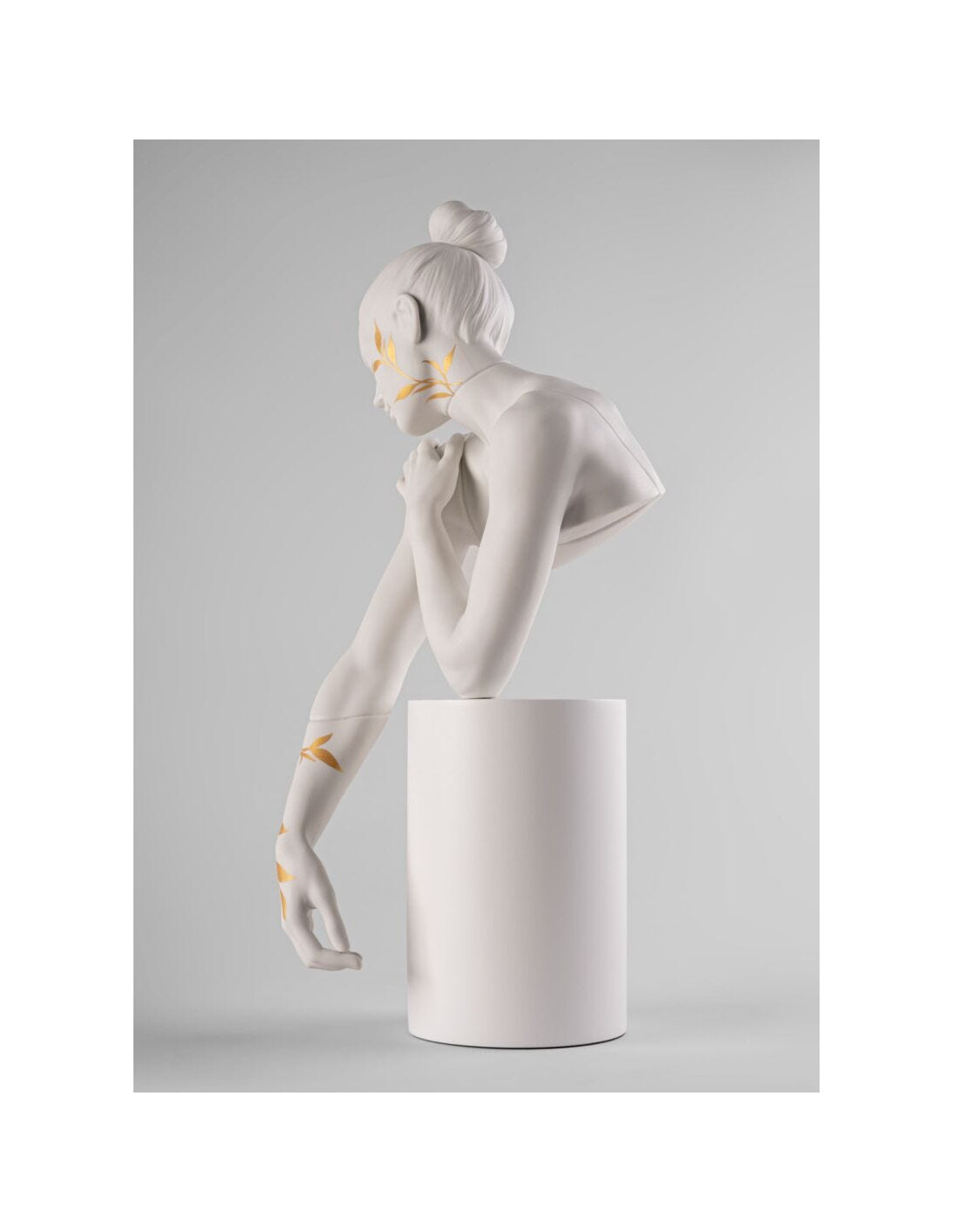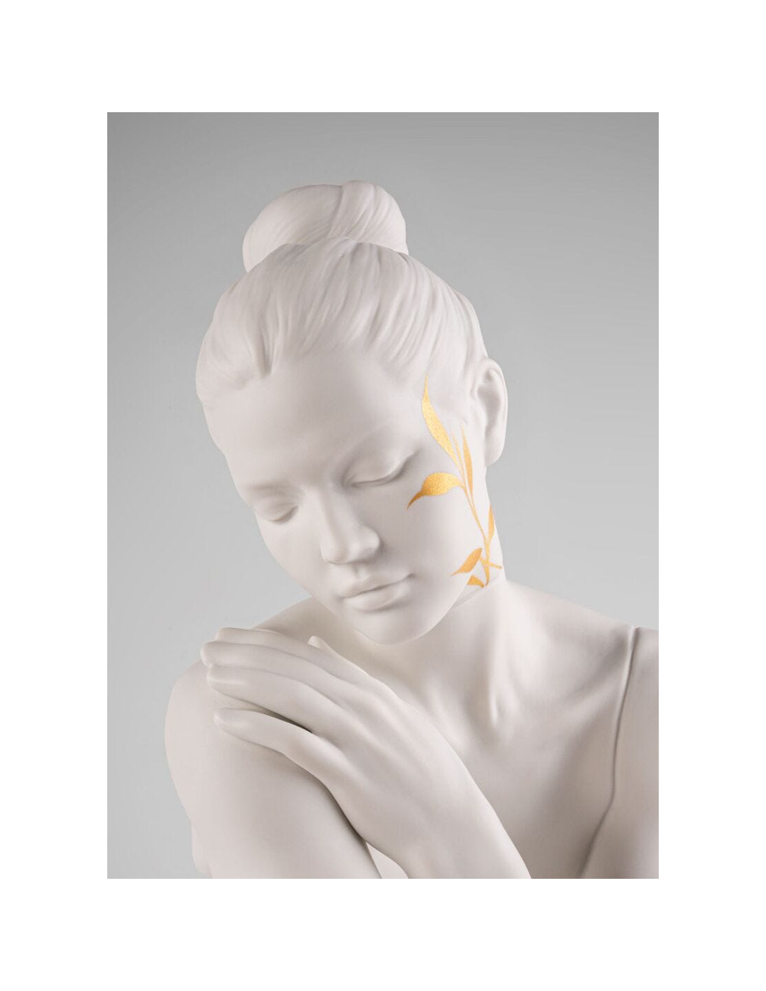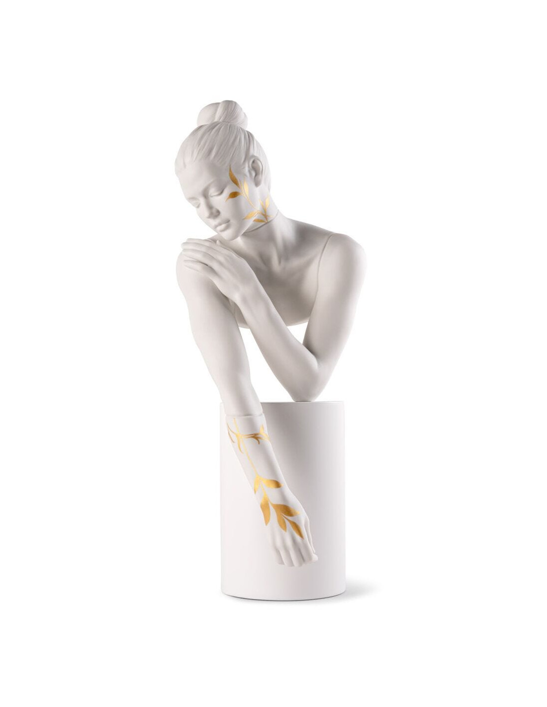 Busto femminile realizzato in porcellana bianca che mostra una donna in atteggiamento riflessivo. La decorazione con lustro dorato assume un ruolo centrale. Le foglie che scorrono lungo il viso e le braccia si dispiegano come un segno luminoso, una presenza sottile che evoca il modo in cui la luce attraversa la vegetazione e proietta forme mutevoli sulla pelle.