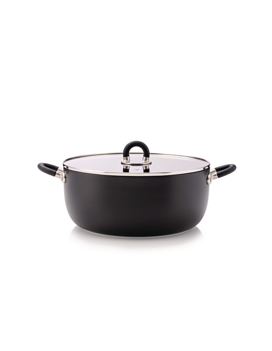Pentola in alluminio con rivestimento interno antiaderente e rivestimento esterno, nero. Manici in acciaio con rivestimento siliconico. Coperchio in vetro, pomolo in acciaio con rivestimento siliconico.